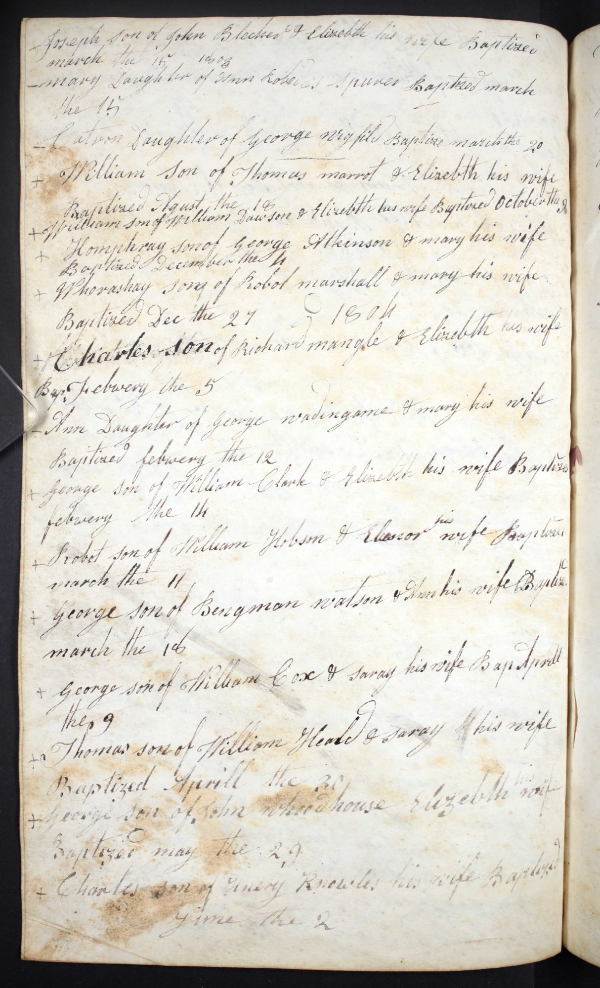 + Charles son of Richard mangle & Elizabeth his wife Baptised February the 5
